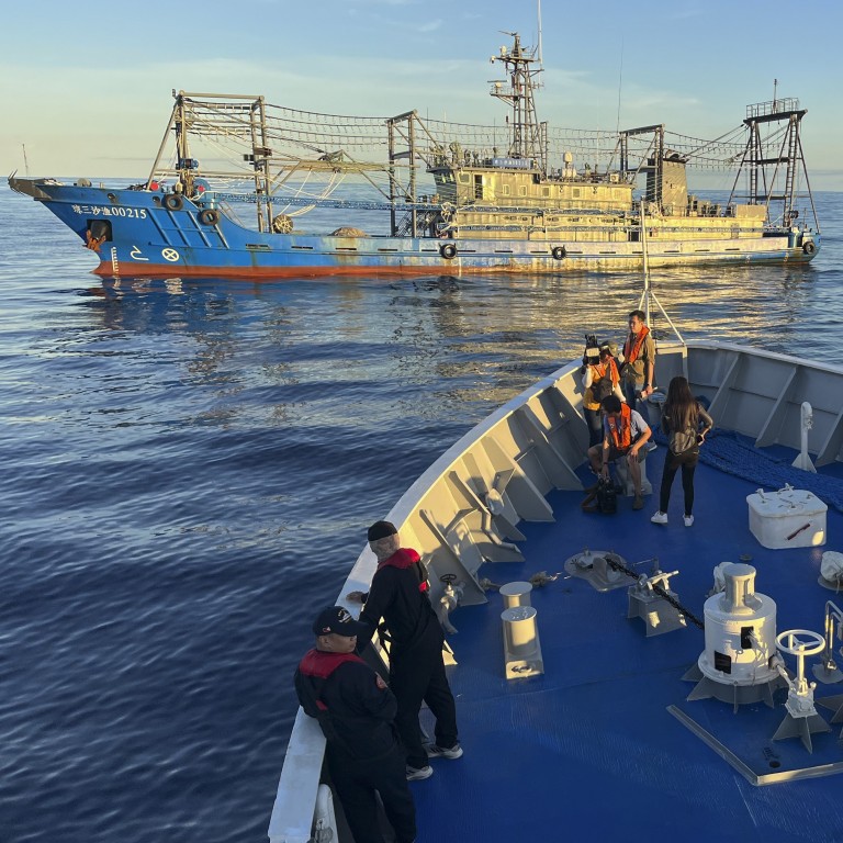 The images depict a clear power imbalance between the Philippines, in a defensive posture, and more dominant Chinese forces, spraying a water hose on the smaller fishing vessel.