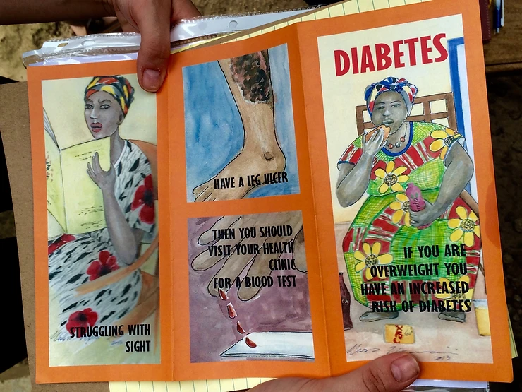 The man showing our team the diabetes symptoms flyer provided from the hospital.